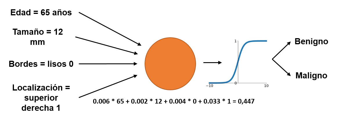 La complejidad de la arquitectura de una red neuronal es la principal razón por la que son difíciles de interpretar. Siguiendo con el ejemplo de más arriba, imaginemos una neurona artificial (la unidad de funcionamiento básica de una red neuronal) como una simple célula que recibe información (por ejemplo, edad del paciente, tamaño de un nódulo pulmonar, tipo de bordes del nódulo y localización del nódulo) y la procesa.