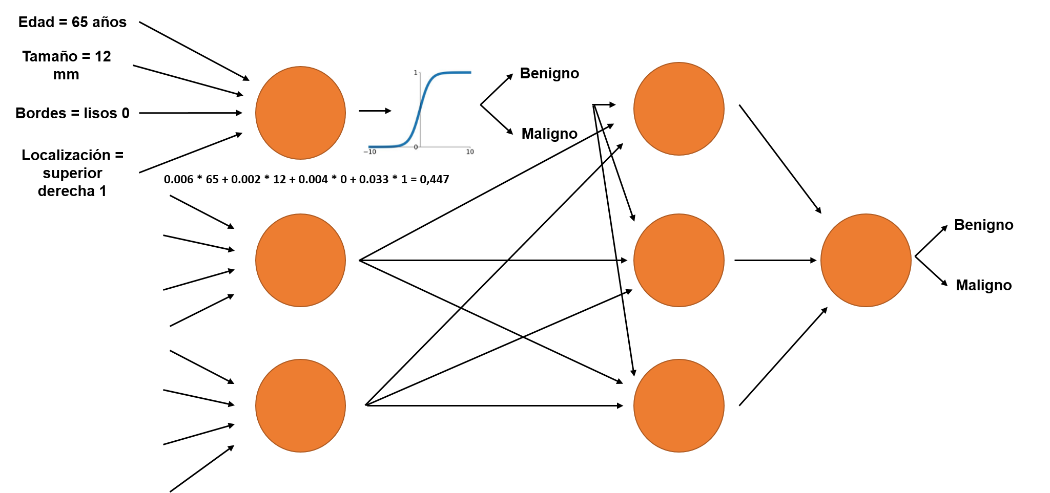 La variable inicial edad que la primera neurona ponderó en un 0.006, se convirtió en un valor que pasado por la función de activación pasó a tres neuronas diferentes donde cada una lo ponderará con un valor nuevo y brindará un nuevo resultado para pasar a la neurona final. Al cabo de sólo dos capas es imposible seguir el rastro de cuánto pesa la variable edad en el resultado final. Imaginemos cuando aumentamos el número de capas y de neuronas en cada capa. ¿Cómo podríamos saber qué porcentaje de edad o de tamaño del nódulo hay en el resultado? Resultaría prácticamente imposible.